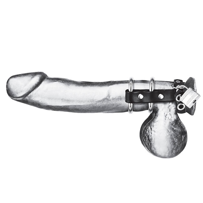 Чёрный ремешок на клёпках с двумя металлическими эрекционными кольцами на пенис для усиления эрекции и пролонгации полового акта. Изделие оснащено стальным замком, который не позволит снять аксессуар, пока хозяйка или господин не снимет замок, тем самым выпустив пленника наружу.