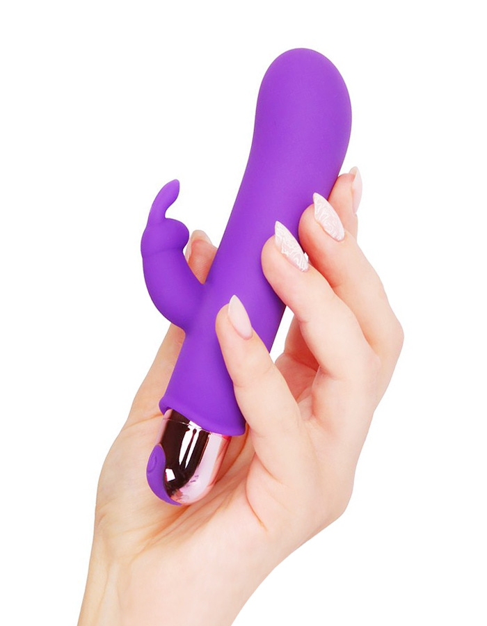 Небольшой фиолетовый вибростимулятор-кролик с клиторальным стимулятором для одновременной двойной стимуляции.